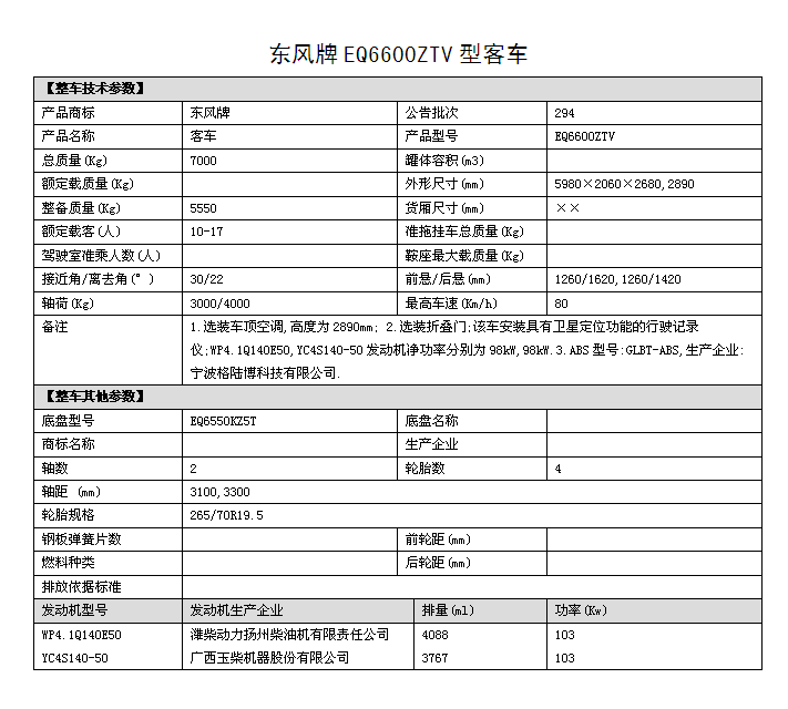 新聞中心EQ6600ZTV四驅越野客車圖片,國五排放四驅10座越野客車價格,6米四驅客車多少錢,東風四驅越野客車參數(shù)配置: 1.底盤型號EQ6550KZ5T,發(fā)動機型號:YC4S140 50 國五排放 2.整車外形尺寸長寬高:(5980×2060×2890)mm 驅動形式:4×4 東風分時四驅 3.離合助力,方向助力,斷氣剎,鼓式自動,駕駛區(qū)域空調 4.車橋為東風德納,輪胎為265/70R19.5型越野輪胎,ABS 5.工具箱,前置防裝杠,粘接式推拉玻璃,發(fā)動機底板防護 6.鋁花紋地板,中檔皮革座椅10個+1個折疊座椅,整車座椅安全帶,手動式外擺門,正副司機門,后置雙開門,東風原廠派恩頂置空調 , 7.窗簾,滅火器兩個,備胎一個,獨立燃油暖風系統(tǒng)帶兩個雙面王出風口 8.其它為EQ6600ZTV型四驅越野客車標配。具體配置參數(shù)參照(附件一)。 成品合格證、全額上戶發(fā)票、隨車工具、隨車文件各一套。