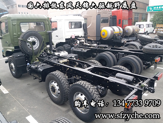 國六排放東風天錦六驅越野底盤,東風天錦D530一排半駕駛室,6×6驅動,康明斯B6.2NS6B210國六發(fā)動機210馬力,最大扭矩:850N.m/1100-1700rpm,排量6.2L、韶齒手動六檔變速箱,東風德納車橋,前驅動橋4.5噸,中后橋都為軍工德納4.5噸驅動橋,大花紋越野輪胎,軸距3500+1250mm,電動玻璃,方向助力,斷氣剎,ABS,大燈自動調節(jié),自動調整臂,選裝原廠空調。