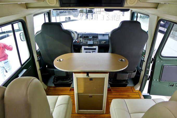 越野房車內(nèi)飾:可以看到,柚木地板外加兩個(gè)電動座椅與一個(gè)帶儲藏柜的可移動多功能桌構(gòu)成了這輛越野房車的第二排。除此之外,頭頂上方安置有26寸索尼液晶電視和帶衛(wèi)星電視機(jī)頂盒的藍(lán)光播放器,微波爐烤箱、小型冰箱、電磁爐等常用設(shè)備也是一應(yīng)俱全,當(dāng)然恒溫式的出水系統(tǒng)以及真空馬桶、獨(dú)立淋浴也是一樣不少。具備天窗和側(cè)窗的尾箱處安置有兩張舒適的標(biāo)準(zhǔn)床鋪,可以說盡管這輛U5000并非加長特裝版,但所有居住設(shè)備都很齊全。
