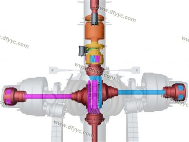 另外,這種斷開式車橋的輪間差速器并不在橋包中,而是被轉(zhuǎn)移到了脊柱套管了,左右側(cè)車輪分別由兩套錐齒輪驅(qū)動(dòng),為了讓這兩套錐齒輪互不干涉,其左右半軸在縱向錯(cuò)開了一定的距離,也就是說它的兩個(gè)半軸并不在一個(gè)平面內(nèi)。類似的設(shè)計(jì)手法裝載機(jī)(4X4軸轉(zhuǎn)向的裝載機(jī))上也有使用,還有采用錯(cuò)開一定角度的做法來避免左右錐齒輪互相干涉的情況。